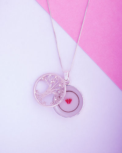 Colgante tipo relicario que puede atesorar los recuerdos más preciados en su interior, protegerá eternamente el recuerdo que desees atesorar en él (leche materna, pelito, cenizas y mucho más).