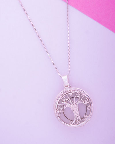 Material base: Plata de ley, técnica filigrana, el dije mide aproximadamente 2 cm, la cadena se incluye en el material elegido.