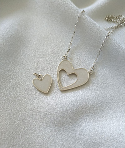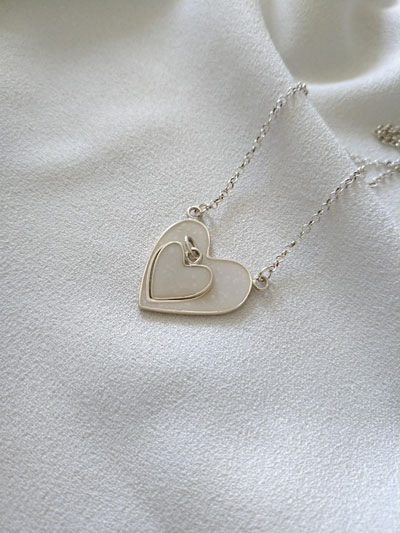 Duo de dijes en corazón que se complementan. Perfectos para compartir un recuerdo de amor en leche materna o cenizas.