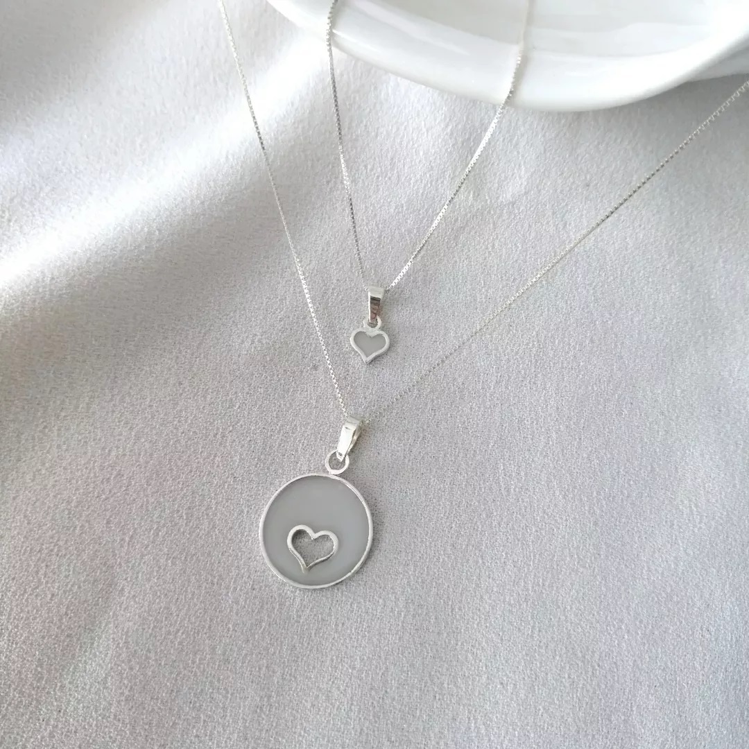 Duo de collares que se complementan un corazón mini y dije corazón redondo, pueden atesorar leche materna o cenizas, son perfectos para compartir.